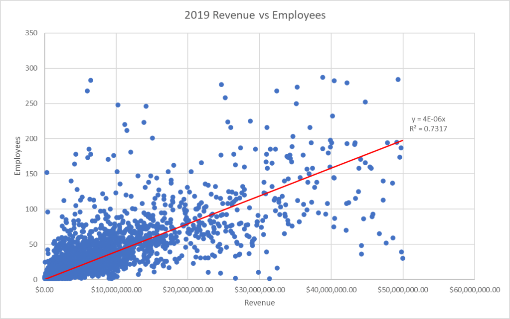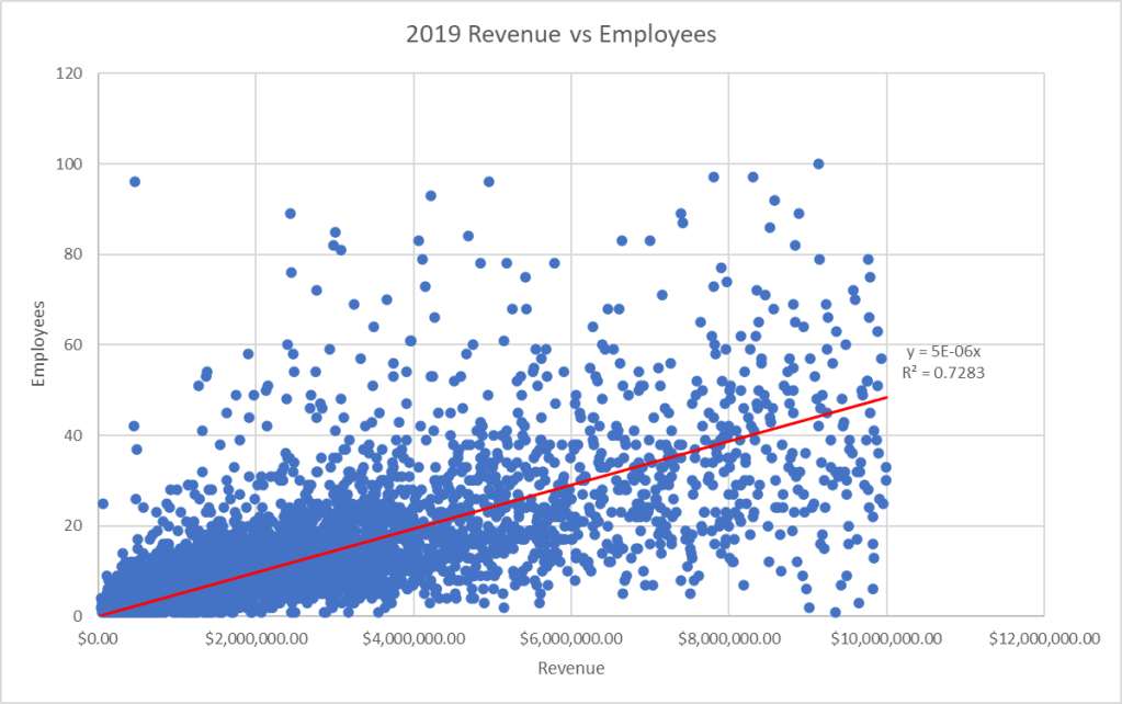 Finally, looking at those under 40 employees and $4M in revenue (n=1342), we also see $200,000 per employee.